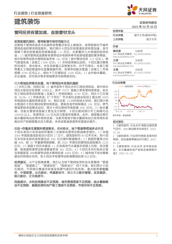 【天风证券】【20220206】建筑装饰行业深度研究_管网投资有望加速_首推管材龙头-42页