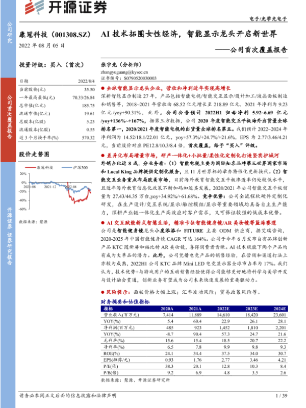 【开源证券】【20220805】深度报告-20220805-开源证券-康冠科技-001308.SZ-公司首次覆盖报告_AI技术拓圈女性经济_智能显示龙头开启新世界-39页