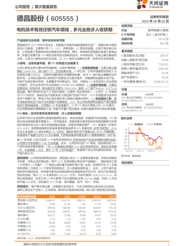 【天风证券】【20220805】深度报告-20220805-天风证券-德昌股份-605555.SH-电机技术有效迁移汽车领域_多元业务步入收获期-35页