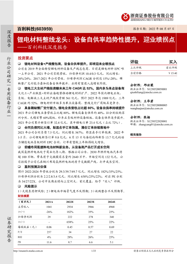 【浙商证券】【20220807】百利科技深度报告_锂电材料整线龙头_设备自供率趋势性提升_迎业绩拐点-33页