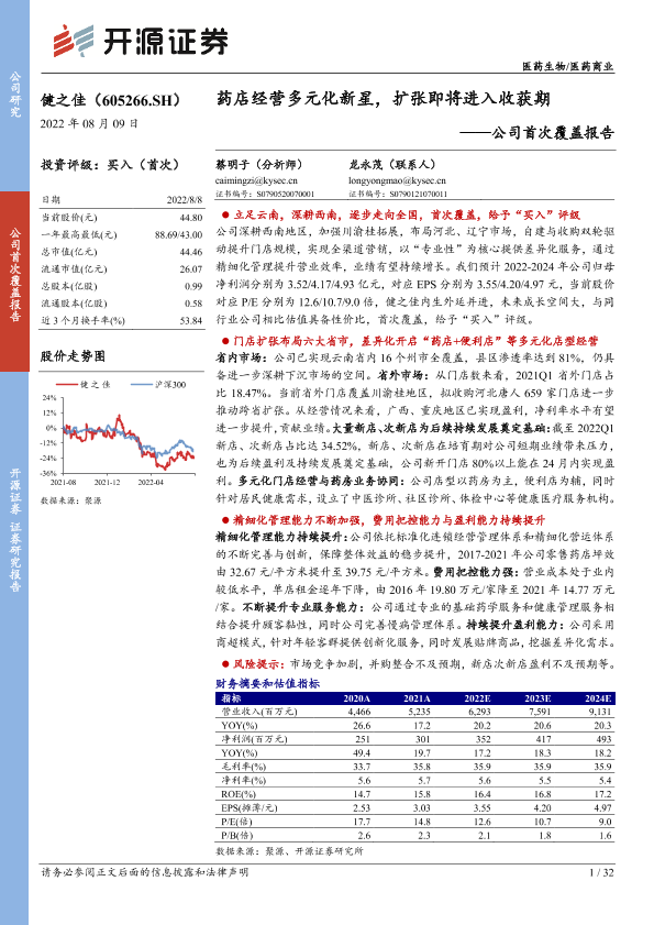 【开源证券】【20220809】深度报告-20220809-开源证券-健之佳-605266.SH-公司首次覆盖报告_药店经营多元化新星_扩张即将进入收获期-32页