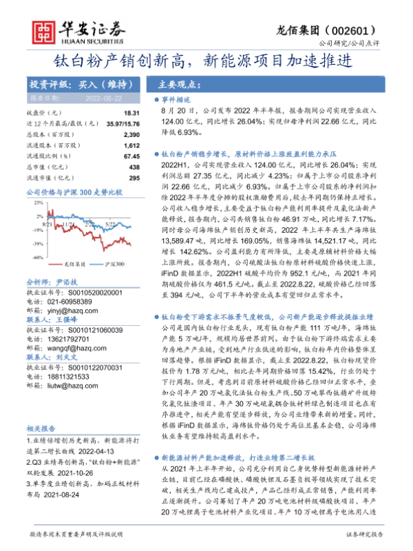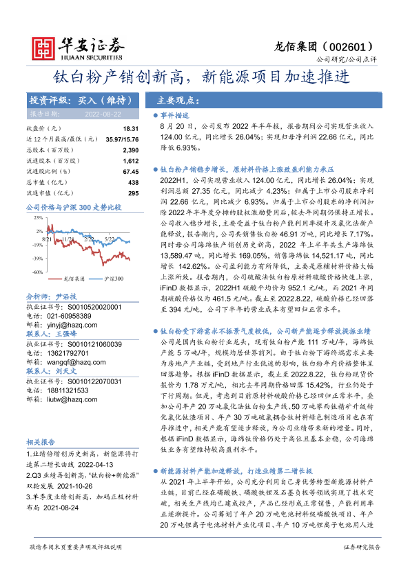 【华安证券】【20220822】钛白粉产销创新高,新能源项目加速推进-4页