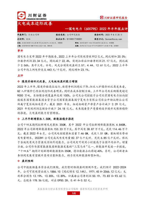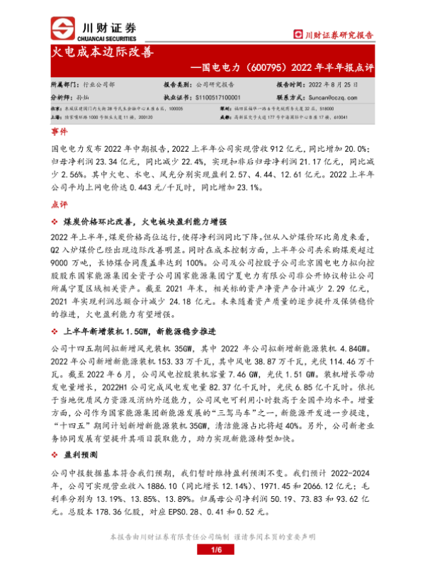 【川财证券】【20220825】国电电力(600795)2022年半年报点评_火电成本边际改善-6页