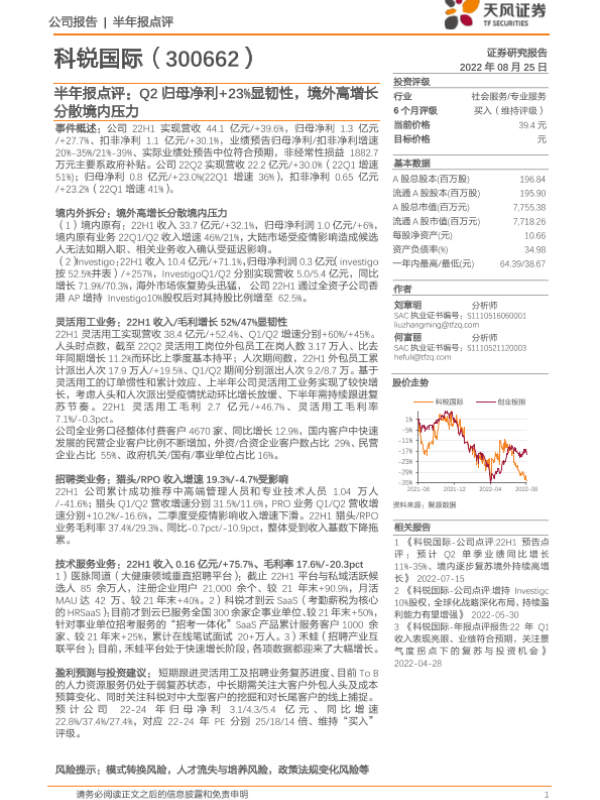 【天风证券】【20220825】科锐国际-半年报点评:Q2归母净利+23_显韧性_境外高增长分散境内压力-4页