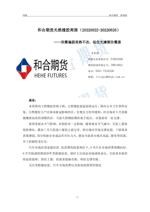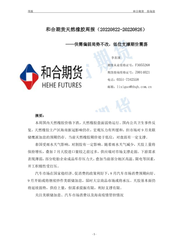 【和合期货】【20220826】和合期货天然橡胶周报(20220822-20220826)——供需偏弱局势不改,低位支撑期价震荡-8页