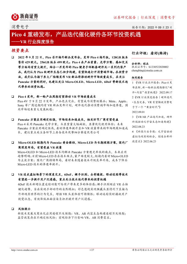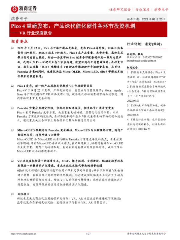 【浙商证券】【20220923】Pico4重磅发布,产品迭代催化硬件各环节投资机遇——VR行业深度报告-27页