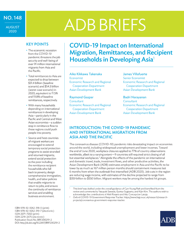 【Asian Development Bank】【202008】COVID-19对亚洲发展中国家国际移民,汇款和接收家庭的影响-14页