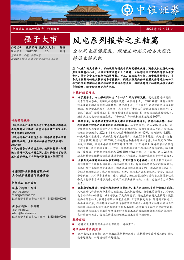 【中银证券】【20221031】风电系列报告之主轴篇:全球风电蓬勃发展,锻造主轴龙头抢占大型化铸造主轴先机-43页