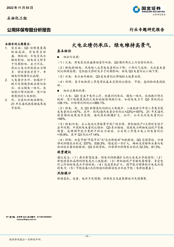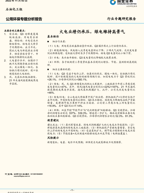 【国金证券】【20221103】公用环保专题分析报告:火电业绩仍承压,绿电维持高景气-20页