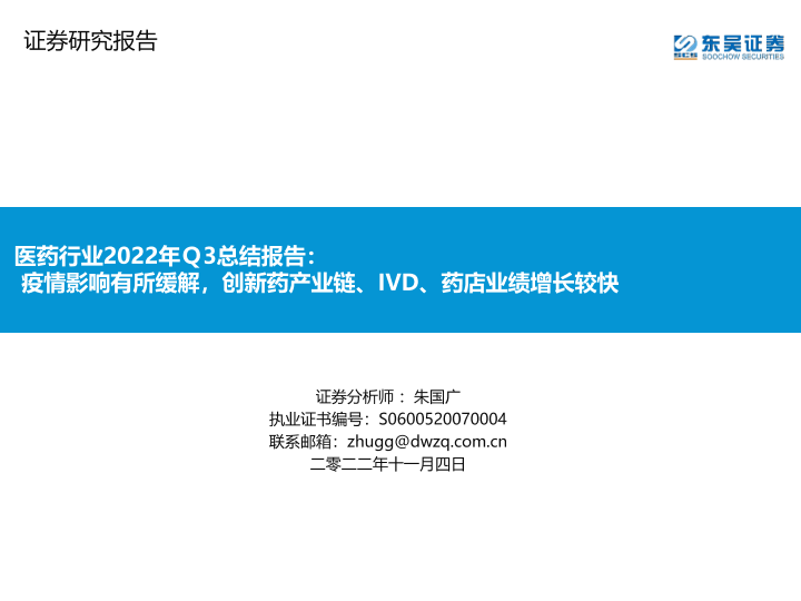 【东吴证券】【20221104】医药行业2022年Q3总结报告:疫情影响有所缓解,创新药产业链、IVD、药店业绩增长较快-75页