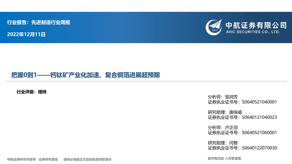 【中航证券】【20221211】先进制造行业周报_把握0到1——钙钛矿产业化加速_复合铜箔进展超预期-20页
