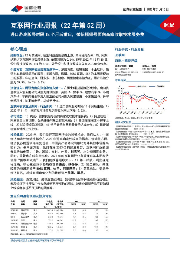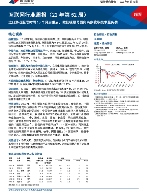 【国信证券】【20230110】20230110-国信证券-互联网行业周报(22年第52周)_进口游戏版号时隔18个月后重启_微信视频号面向商家收取技术服务费-13页