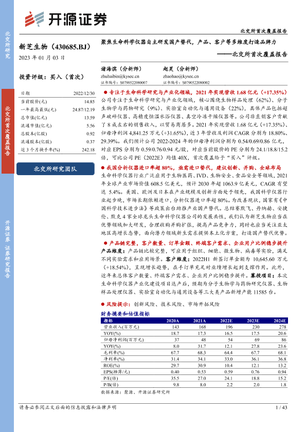 【开源证券】【20230103】北交所首次覆盖报告_聚焦生命科学仪器自主研发国产替代_产品_客户等多维度打造品牌力-43页