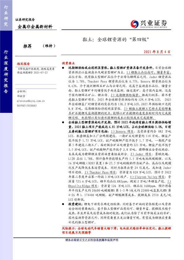 【兴业证券】【20210804】金属非金属新材料行业:黏土,全球锂资源的“第四极”-30页