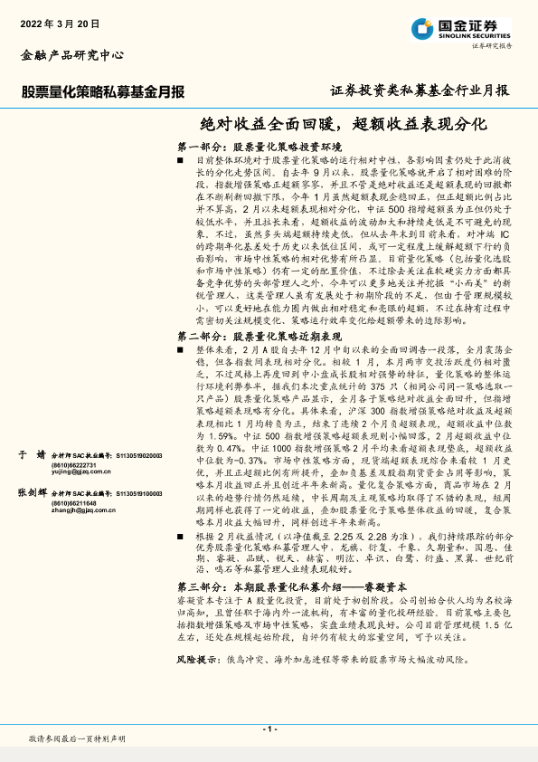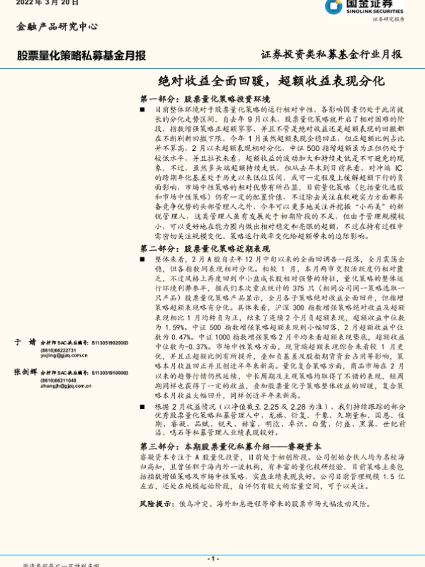 【国金证券】【20220320】证券投资类私募基金行业月报:绝对收益全面回暖,超额收益表现分化-15页