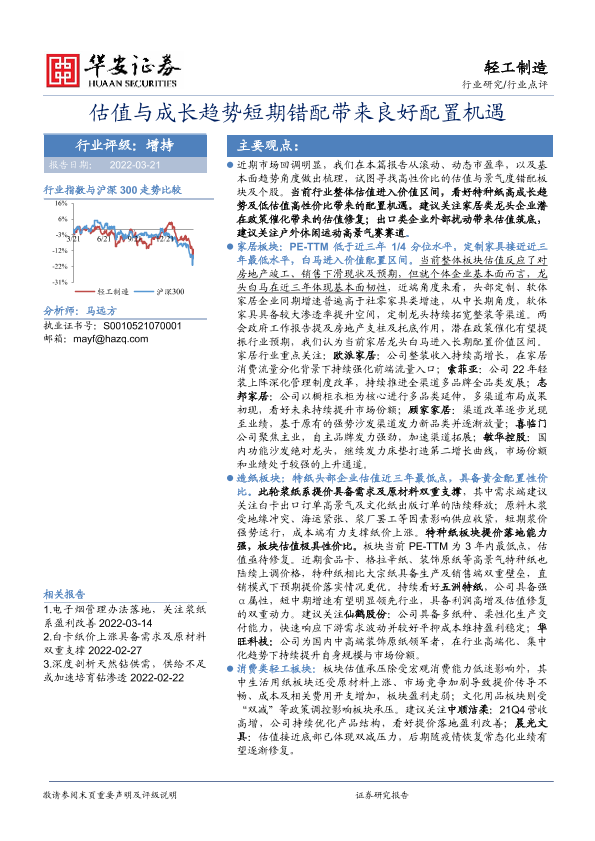 【华安证券】【20220321】轻工制造行业点评:估值与成长趋势短期错配带来良好配置机遇-25页