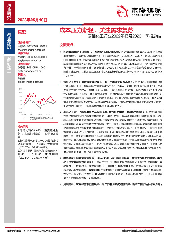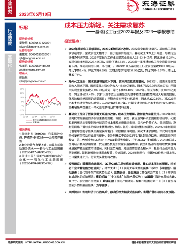 【东海证券】【20230510】成本压力渐轻,关注需求复苏——基础化工行业2022年报及2023一季报总结-18页