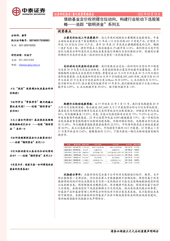 【中泰证券】【20220318】追踪“聪明资金”系列五:借助基金定价权把握仓位动向,构建行业轮动下选股策略-23页