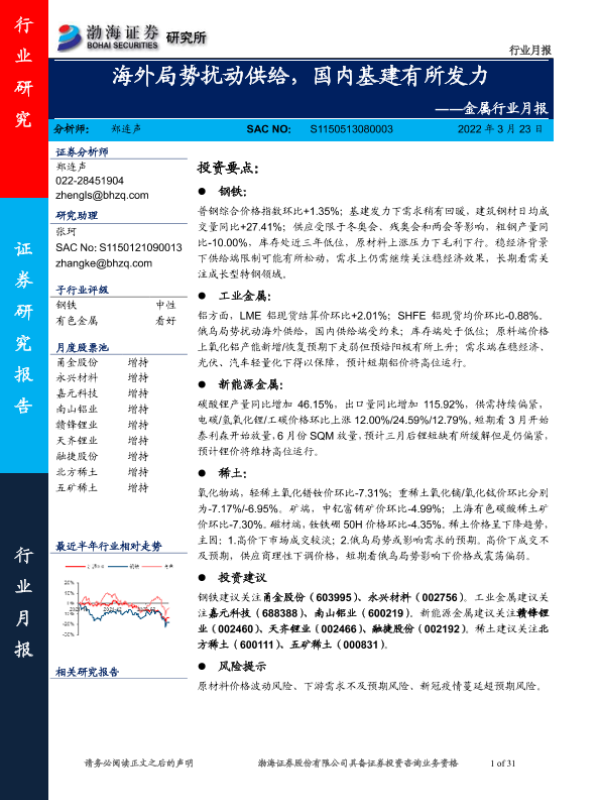 【渤海证券】【20220323】金属行业月报:海外局势扰动供给,国内基建有所发力-31页