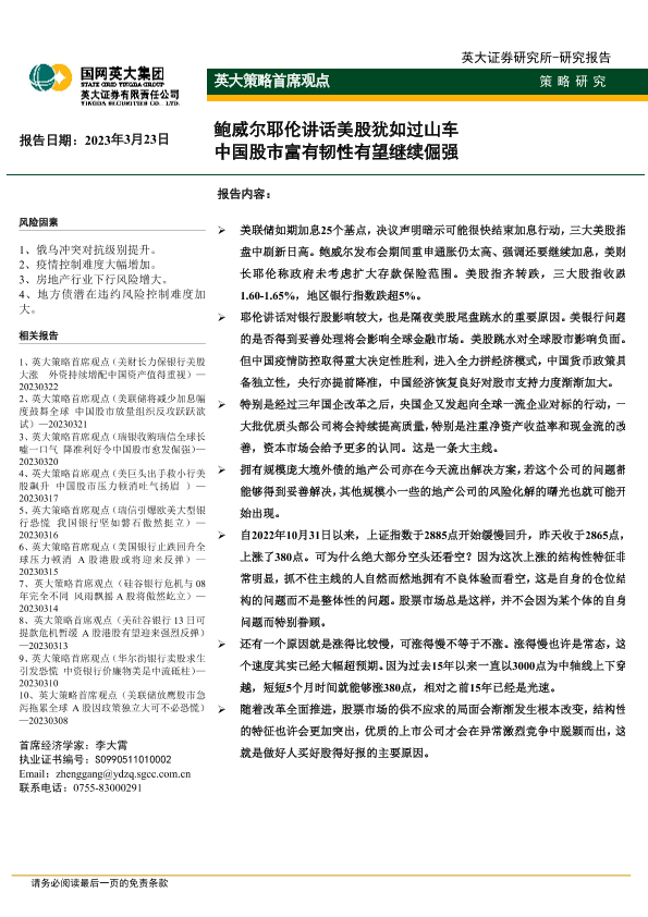 【英大证券】【20230323】英大证券-英大策略首席观点_鲍威尔耶伦讲话美股犹如过山车_中国股市富有韧性有望继续倔强-2页