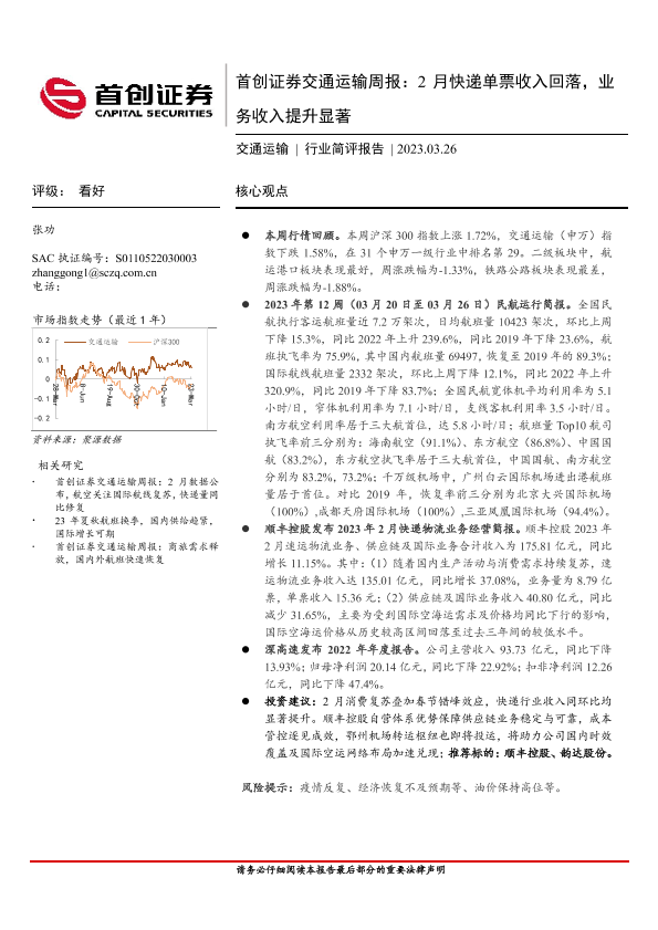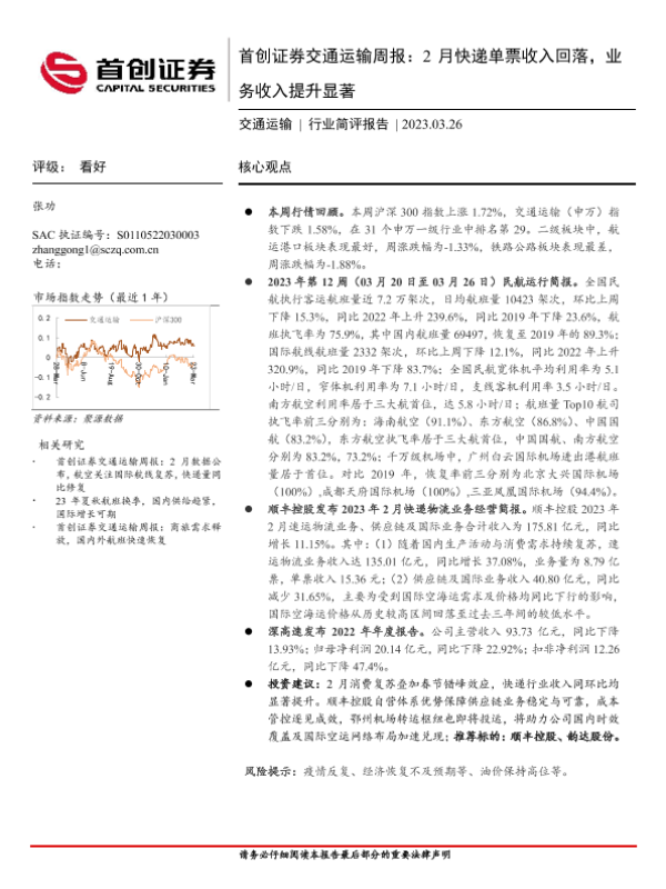 【首创证券】【20230326】首创证券交通运输周报:2月快递单票收入回落,业务收入提升显著-14页