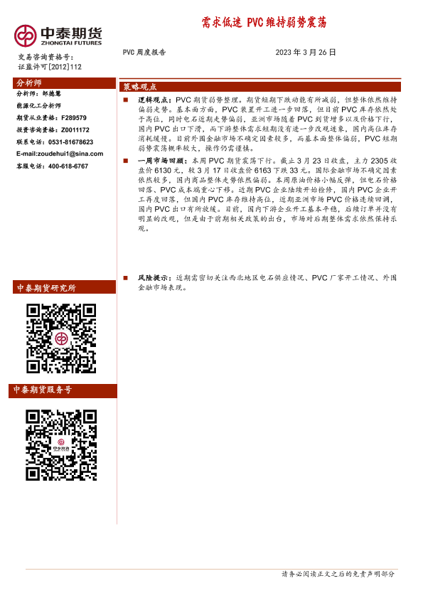 【中泰期货】【20230326】需求低迷 PVC维持弱势震荡-6页