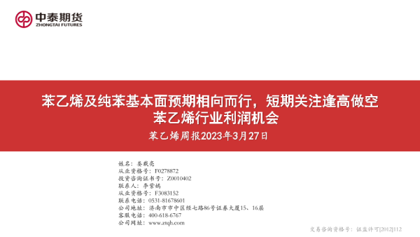 【中泰期货】【20230327】苯乙烯及纯苯基本面预期相向而行_短期关注逢高做空苯乙烯行业利润机会-17页
