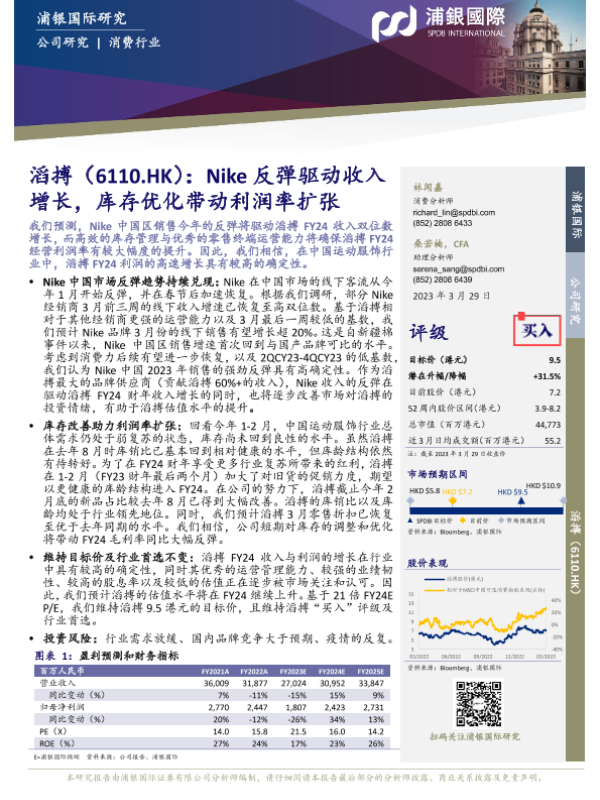 【浦银国际】【20230329】滔搏:Nike反弹驱动收入增长,库存优化带动利润率扩张-6页