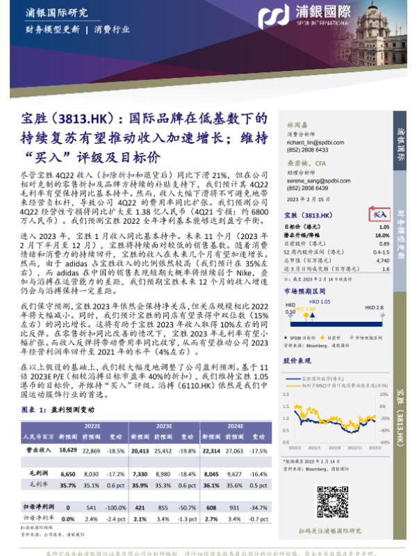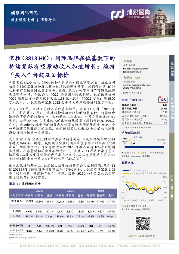 【浦银国际】【20230215】宝胜国际-国际品牌在低基数下的持续复苏有望推动收入加速增长;维持买入评级及目标价-6页