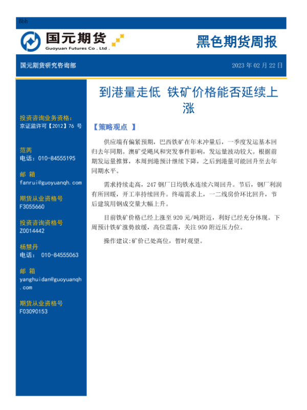 【国元期货】【20230222】黑色期货周报_到港量走低_铁矿价格能否延续上涨-11页