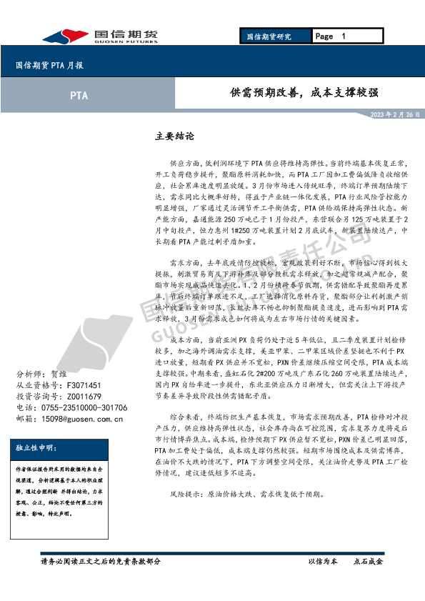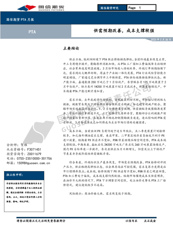 【国信期货】【20230226】PTA月报_供需预期改善_成本支撑较强-7页