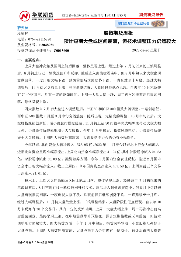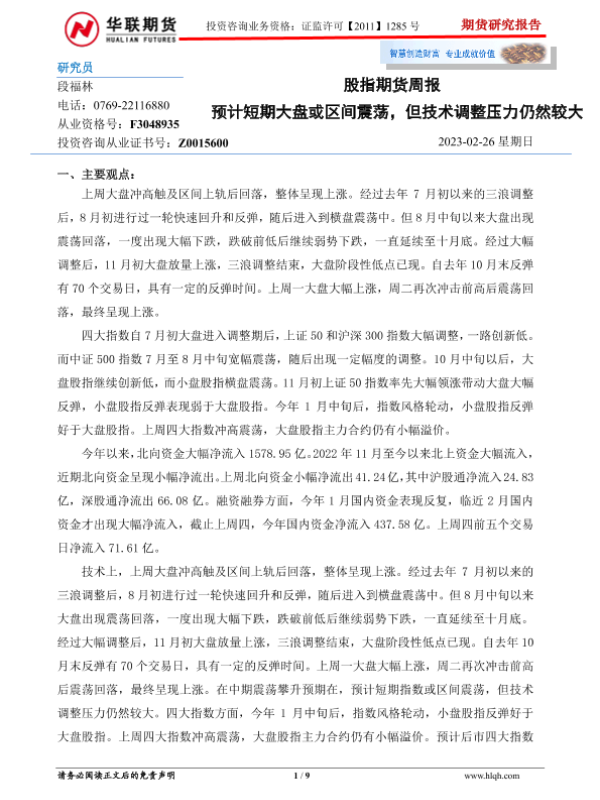 【华联期货】【20230226】20230226-华联期货-股指期货周报_预计短期大盘或区间震荡_但技术调整压力仍然较大-9页