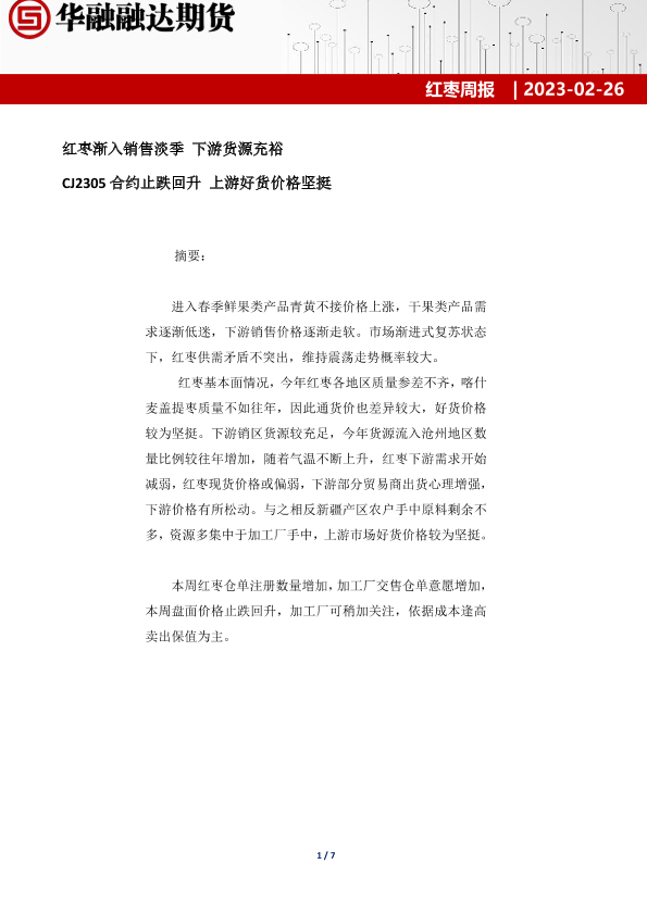 【华融融达期货】【20230226】红枣周报_红枣渐入销售淡季_下游货源充裕_CJ2305合约止跌回升_上游好货价格坚挺-7页