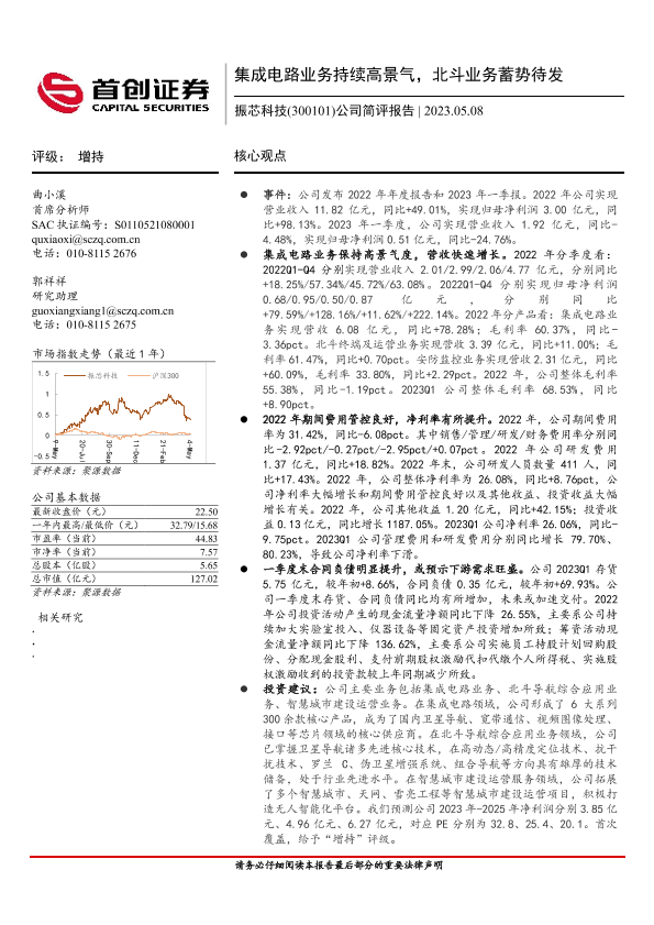 【首创证券】【20230508】振芯科技(300101)公司简评报告 集成电路业务持续高景气,北斗业务蓄势待发-4页