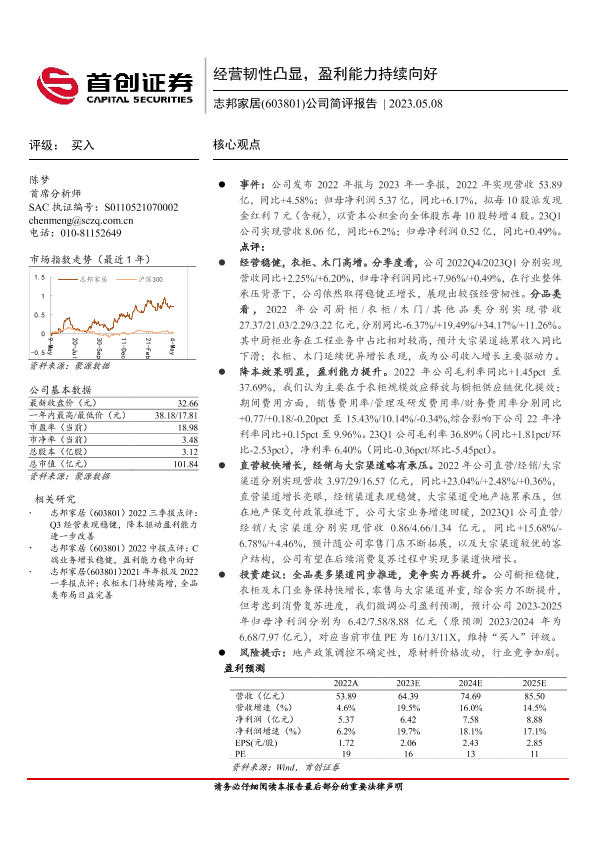 【首创证券】【20230508】志邦家居(603801)公司简评报告:经营韧性凸显,盈利能力持续向好-3页