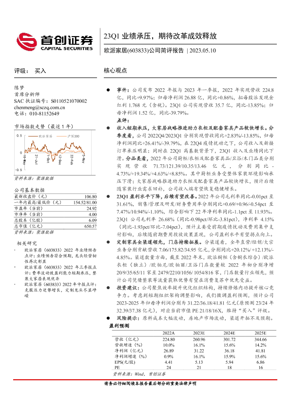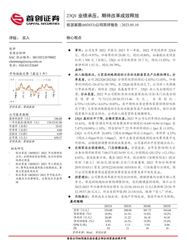 【首创证券】【20230510】欧派家居(603833)公司简评报告_23Q1业绩承压_期待改革成效释放-3页