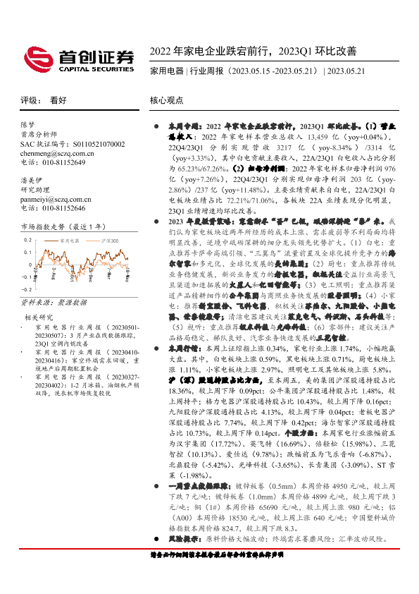 【首创证券】【20230521】20230521-首创证券-家用电器行业周报_2022年家电企业跌宕前行_2023Q1环比改善-27页