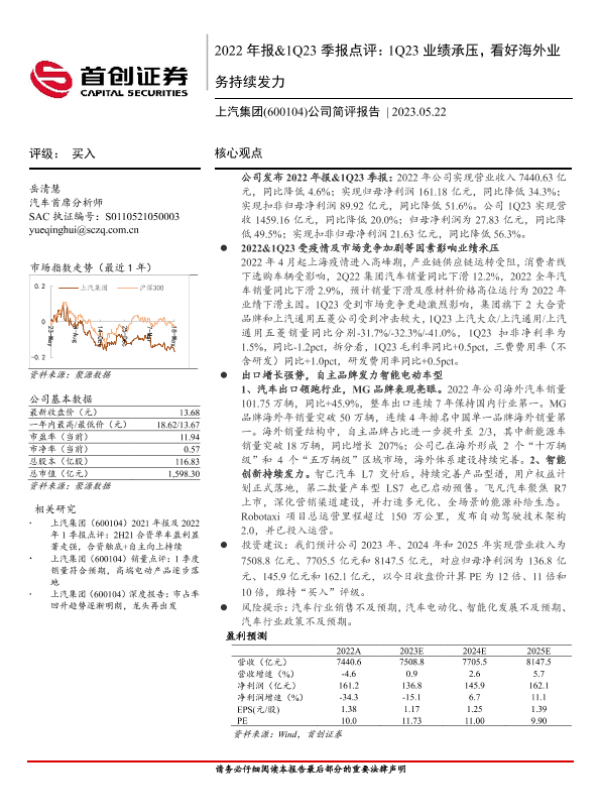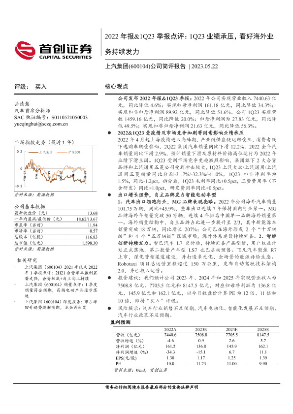 【首创证券】【20230522】20230522-首创证券-上汽集团-600104.SH-2022年报_1Q23季报点评_1Q23业绩承压_看好海外业务持续发力-4页