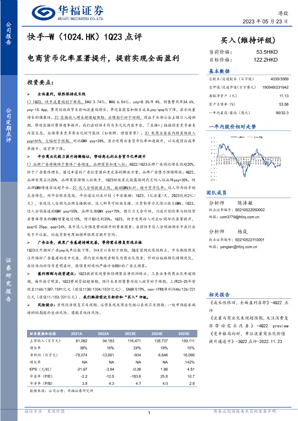【华福证券】【20230523】快手-W(1024.HK)1Q23点评:电商货币化率显著提升,提前实现全面盈利-4页