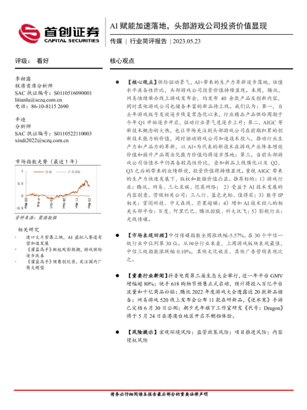 【首创证券】【20230523】AI赋能加速落地,头部游戏公司投资价值显现-12页