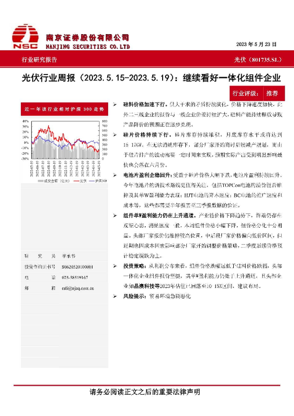 【南京证券】【20230523】光伏行业周报 继续看好一体化组件企业-6页