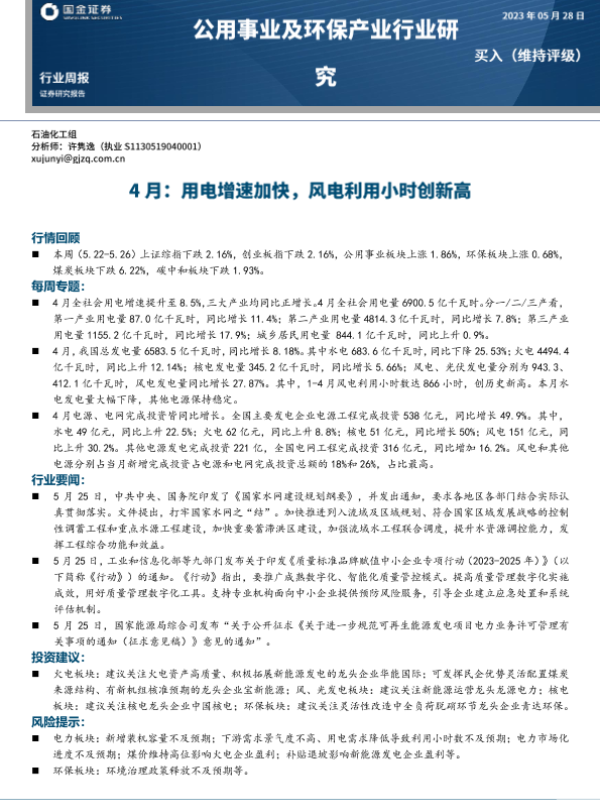 【国金证券】【20230528】20230528-国金证券-公用事业及环保产业行业研究_4月_用电增速加快_风电利用小时创新高-17页