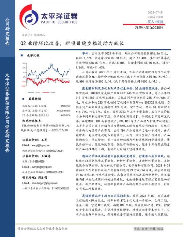 【太平洋证券】【20230731】20230731-太平洋-万华化学-600309.SH-Q2业绩环比改善_新项目稳步推进助力成长-5页