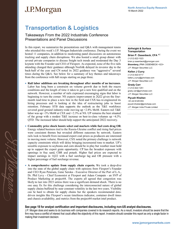 【J.P. Morgan】【20220318】J.P. 摩根-美股运输及物流行业-2022年工业会议演讲和小组讨论的要点-22页