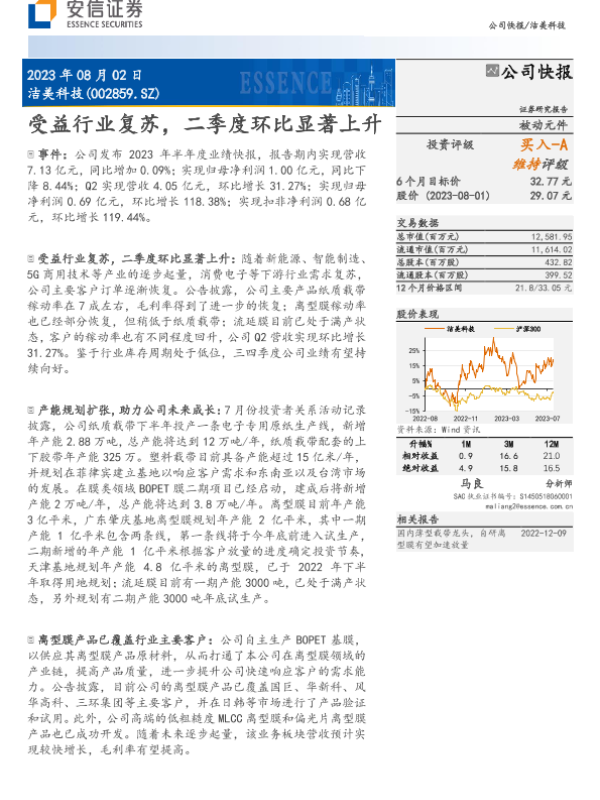 【安信证券】【20230802】洁美科技受益行业复苏_二季度环比显著上升-5页