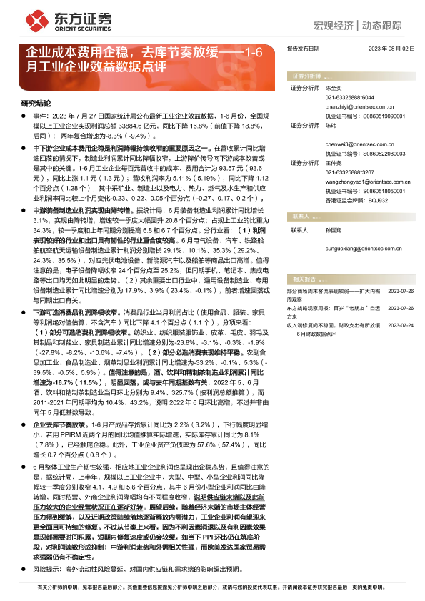 【东方证券】【20230802】1-6月工业企业效益数据点评:企业成本费用企稳,去库节奏放缓-4页