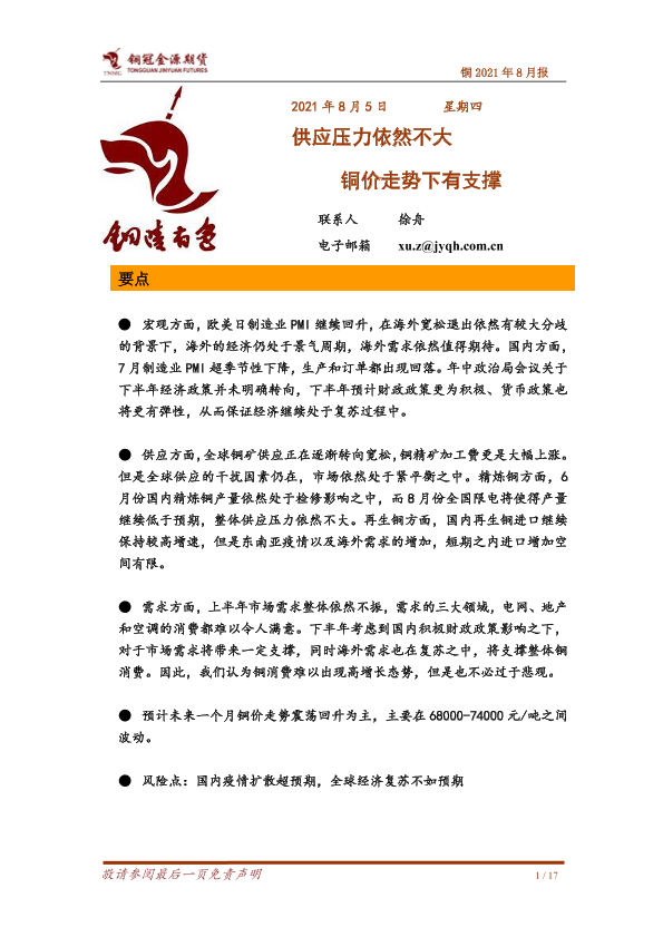 【铜冠金源期货】【20210805】铜2021年8月报:供应压力依然不大,铜价走势下有支撑-17页