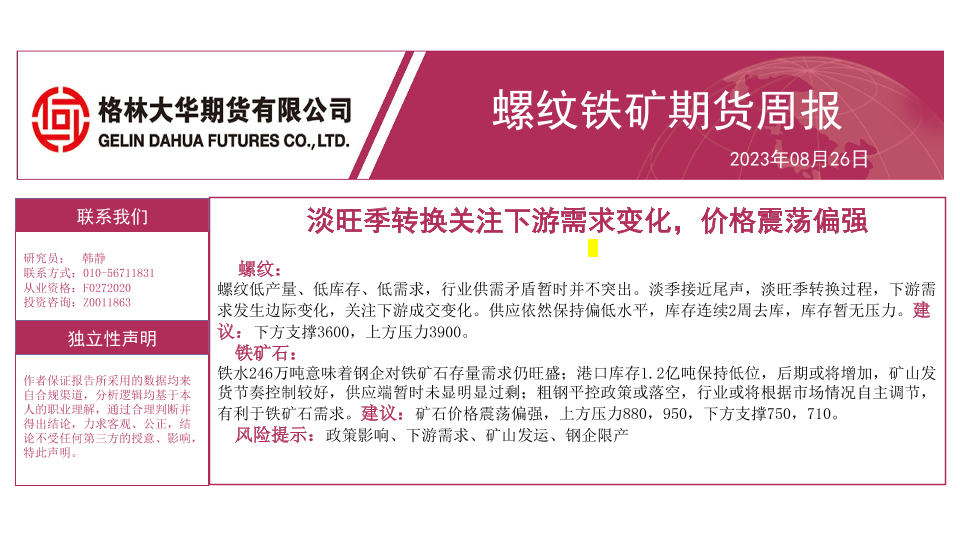 【格林大华期货】【20230826】20230826-格林期货-螺纹铁矿期货周报_淡旺季转换关注下游需求变化_价格震荡偏强-28页