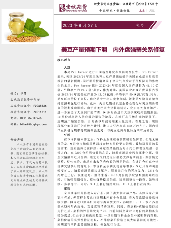 【宝城期货】【20230827】豆类周报_美豆产量预期下调_内外盘强弱关系修复-14页