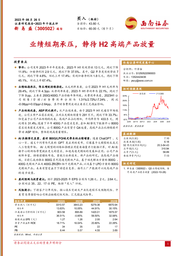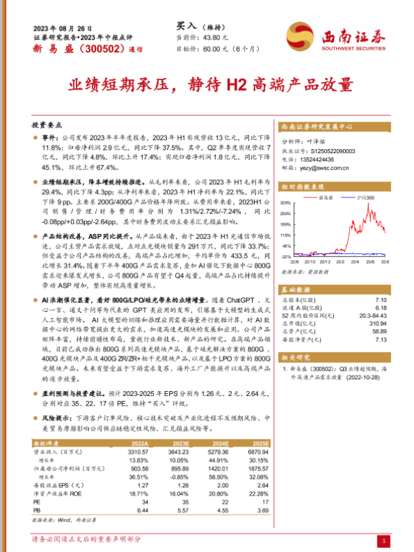 【西南证券】【20230826】20230826-西南证券-新易盛-300502.SZ-业绩短期承压_静待H2高端产品放量-7页